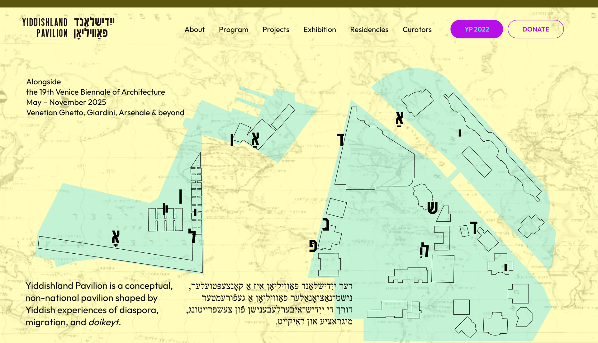 The Yiddishland Pavilion is not merely contained in a sukkah—it is a sukkah. This means the pavilion can exist wherever one is built, multiplying across places and contexts. With this in mind, Sala-manca Group recorded a guided tour in Yiddish, designed to be heard inside a sukkah. In this way, each sukkah in which the tour is streamed becomes a branch of the Venice Biennale—where the temporary Yiddishland Pavilion performs while being listened to. The artwork, the structure, are the Yiddish words.